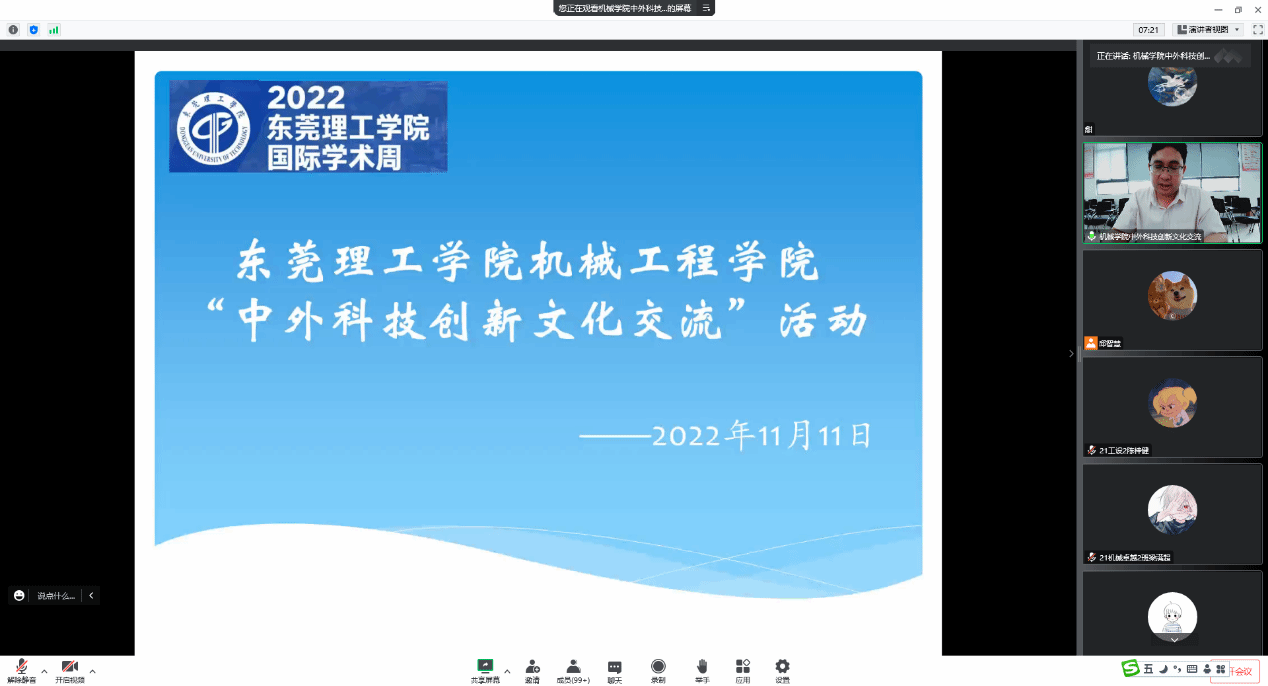 2022年11月11日上午,bv伟德国际1946国际学术周——伟德国际victor1946“中外科技创新文化交流”活动在通过线上会议成功举办,机械工程公司党委书记郭建文、党委委员李钰田、团委书记黄楚刁、辅导员胡娜玲以及机械公司2020届毕业生、现日本大学硕士研究生章智敏和机械公司2020届毕业生、现美国伊利诺伊大学香槟分校研究生骆延东出席活动会议。机械公司300名在校生同步在线参与会议。会议由郭建文主持。