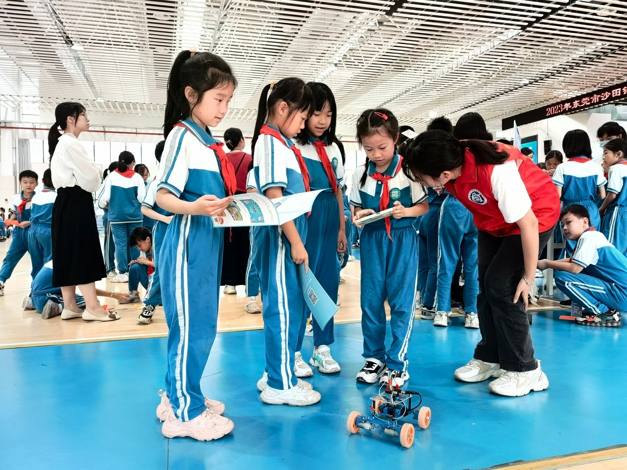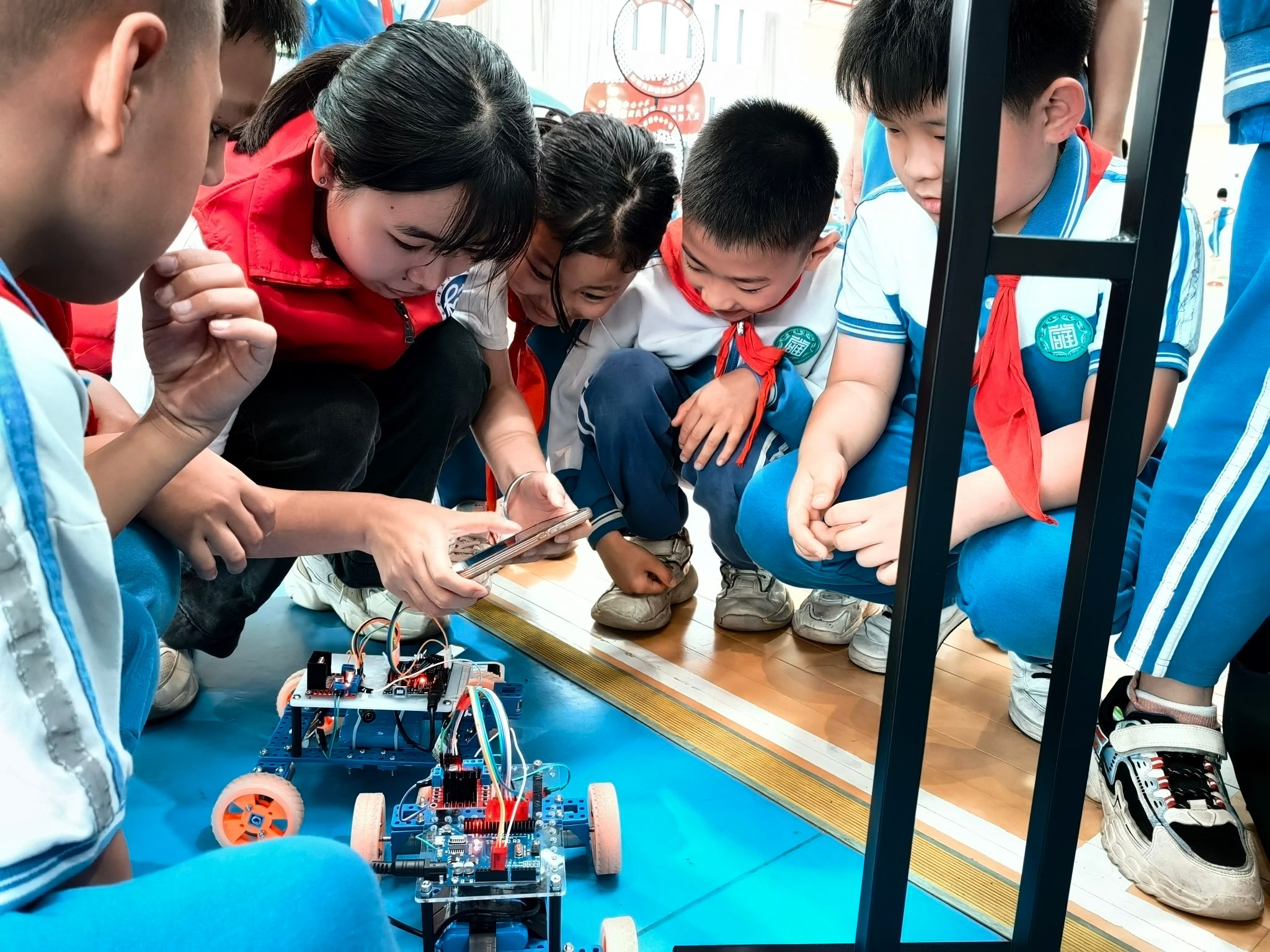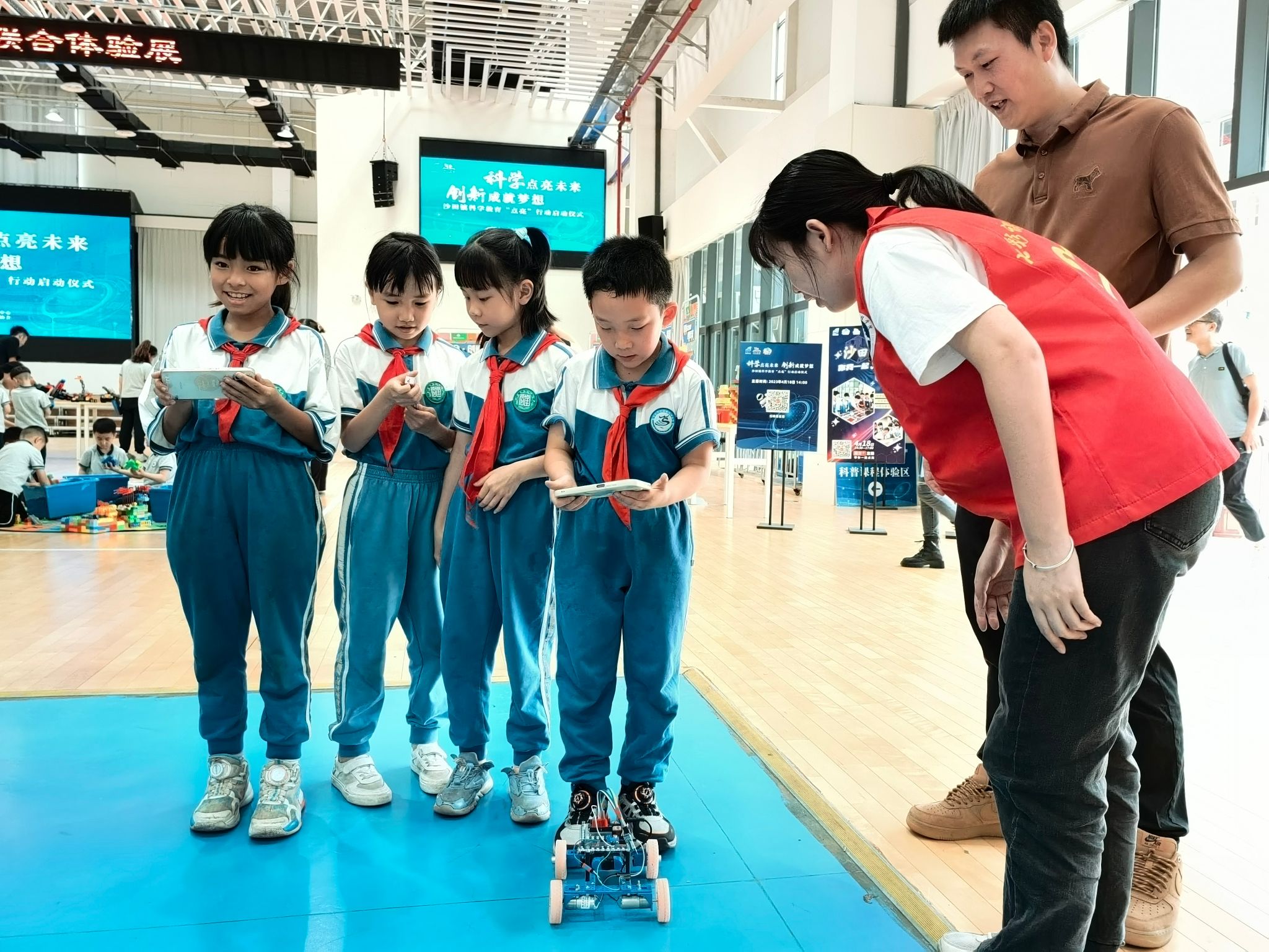 在活动现场,七彩课堂志愿服务队的队员为沙田镇中心小学的员工普及了驱动车装置的组装和运行,介绍了四轮驱动的控制结构和设计理念,并指导员工进行实际遥控操作,让各位小学员在赛场上一较高下,全面开发智力、脑力和动手能力。