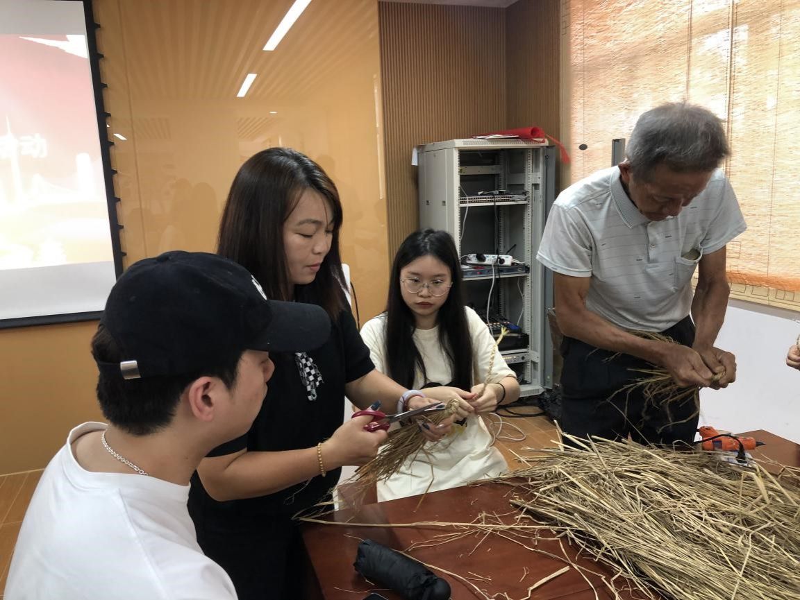 活动过程中,同学们以小组为单位围坐,在师傅们的指导下,体验将一根根稻草条编织成草龙的传统技艺。师傅们一步步示范如何编织草龙,同学们也认真专注地聆听、学习。同学们积极热情的动手编织草龙,分工合作,大家都投入其中。