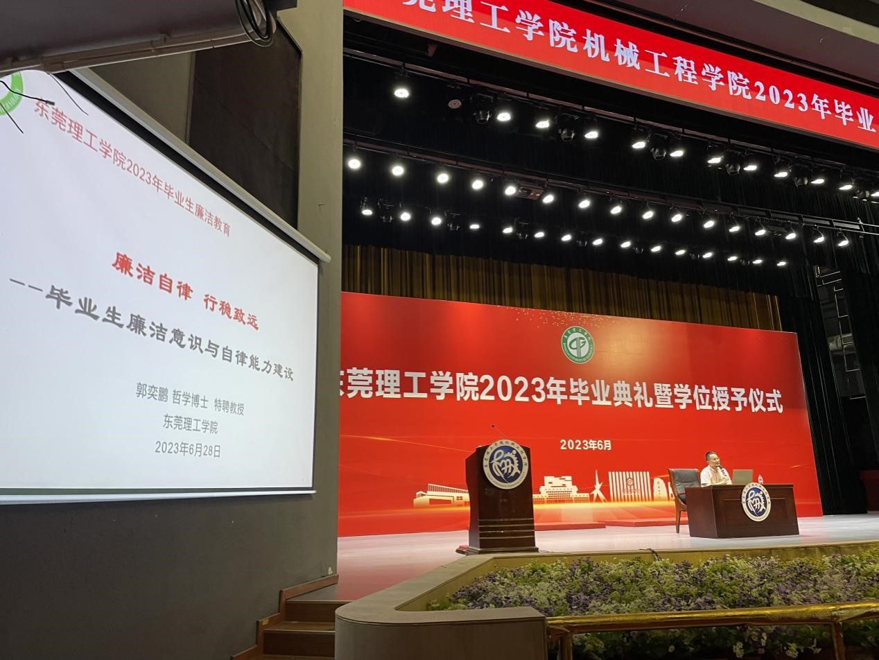 为加强毕业生廉洁教育,扣好大学毕业生走好人生路的“第一粒扣子”,2023年6月28日下午,伟德国际victor1946在松山湖校区大礼堂组织开展2023届毕业生廉洁教育,邀请公司马克思主义公司副经理、特聘教授、公司廉洁讲师团成员郭奕鹏为毕业生讲授大学的“最后一课”。公司领导班子、辅导员、毕业班班主任代表、全体2023届本科毕业生出席活动。