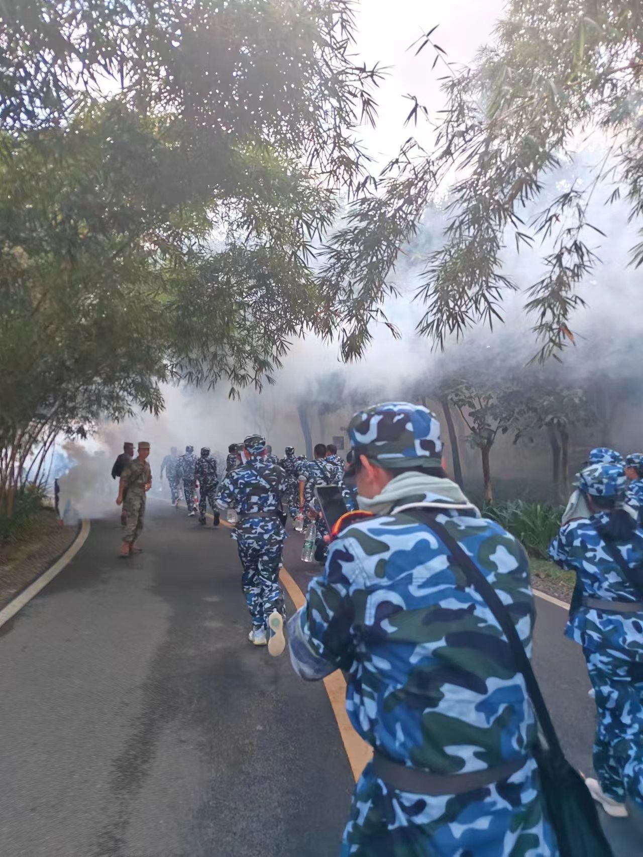 拉练途中军训旅还有序开展了通过染毒地段等训练项目。在行进过程中,面临顷刻间“浓烟四起”的突发状况,教官和指导员迅速指挥员工以弯腰捂口鼻之姿,按指定路线紧急通过,整个过程严肃、安全、有序,同学们的表现得到了教官肯定。