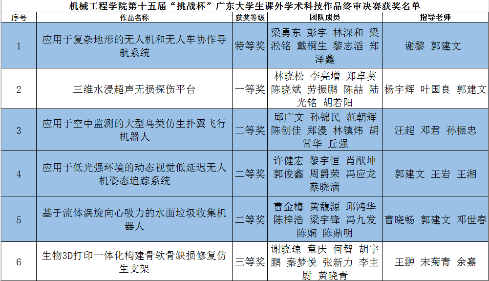 本次竞赛是对机械公司创新创业教育理念的一次检验。获奖作品中,既有体现新工科理念的”应用于复杂地形的无人机和无人车协作导航系统”和”应用于低光强环境的动态视觉低延迟无人机姿态追踪系统”,又有面向科技前沿的“应用于空中监测的大型鸟类仿生扑翼飞行机器人”和“生物3D打印一体化构建骨软骨缺损修复仿生支架”,还有来源于东莞模具产业需求的“三维水浸超声无损探伤平台”以及东莞环保行业需求的 “基于流体涡旋向心吸力的水面垃圾收集机器人”。
