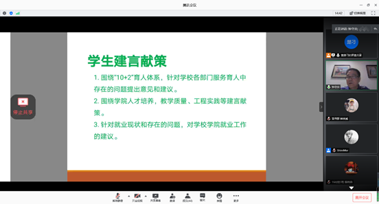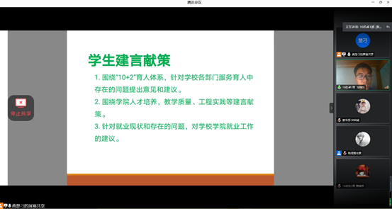 为进一步了解人才培养和公司产品质量,加强对毕业生指导服务,开展就业困难员工帮扶,伟德国际victor1946于6月10日组织毕业生在线上开展2020年“三全育人”员工座谈会暨毕业生代表座谈会。会议由辅导员黄楚刁主持,院领导、各系(副)主任、各毕业班班主任、辅导员以及毕业生代表出席。