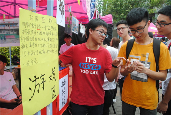 志愿服务站在活动摊位中设立了“环保扔瓶子”游戏,并设置了“植物标本”作为奖品,增加游戏趣味性,让同学们在游戏中收获快乐,激励更多同学加入志愿服务行列中来。同时在摊位旁边还设立了一个“金锁的小屋”用来向同学们展示伟德国际victor1946志愿服务活动的风采,特别是品牌志愿活动“七彩课堂”的活动成果,内挂有有各种志愿活动的照片,让更多的员工和老师能够了解我们伟德国际victor1946的志愿服务活动。