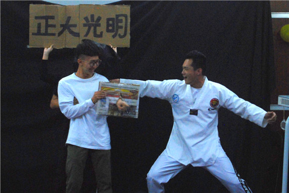 晚会伊始,各部门分别上台表演节目。其中志愿服务站表演的小品《新上海滩》,台词的幽默,动作的搞笑,引得在场观众捧腹开怀。体育部的节目《功夫》以“超级变变变”的形式,将晚会现场推向另一个高潮。