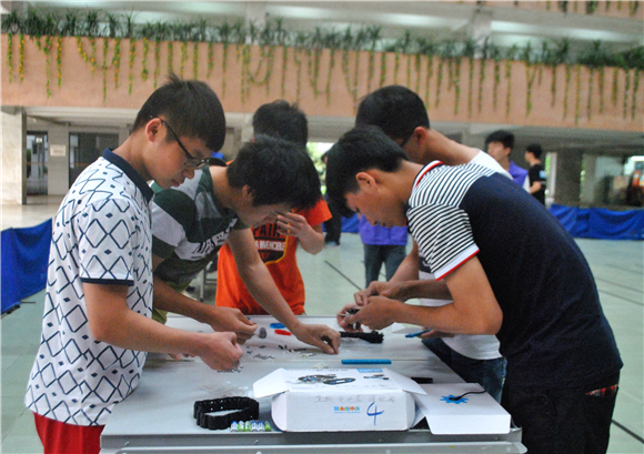 参赛的一百多支队伍在比赛方的安排下分批次进行比赛,一小时一轮,一轮10支队参赛。比赛内容是机器人现场自由拼装和区域行走,选手需在30分钟内组装好自己的机械人并在区域范围内让机械人走完4米的赛道。