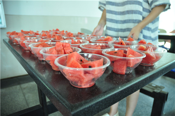 中午,干部们到达莞城校区后,部分干部跟随思想政治辅导员徐伟斌老师去通知机械学子所在连的教官们。在西瓜到达后,干部们在第一饭堂二楼开始了忙碌的准备,他们把西瓜切成块并均分到塑料碗里以便新生们食用。下午时分,教官们陆续带队到第一饭堂休息,干部们为新生们分发西瓜,让新生们能品尝这夏日清凉。几块小小的西瓜清凉了疲惫的身心,也温暖了新生们的心。