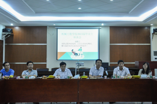 5月22日,伟德国际victor1946于机电楼12C304教室举行2015届毕业生座谈会,参会人员有机械工程公司党总支书记钟守炎教授、经理孙振忠教授、副经理、机械专业群负责人田君副教授、党总支专职副书记陈举铭、经理助理、工业工程专业群负责人张智聪副教授、思想政治辅导员李钰田、黄楚刁、肖毅以及2015届毕业生代表。