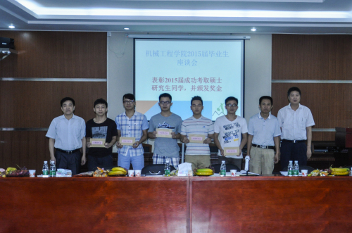 2015届毕业生考研取得优良成绩,共有11名同学上线,6名录取,党总支书记钟守炎教授为考研成功的同学颁发奖金。孙经理表示,今年来考研同学偏少,如何提高考研报名人数是一项重大工作,公司各种设备建设已逐步调整,基本进入状态,希望在座师生能鼓动下一届的同学积极投入考研之中。