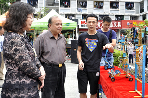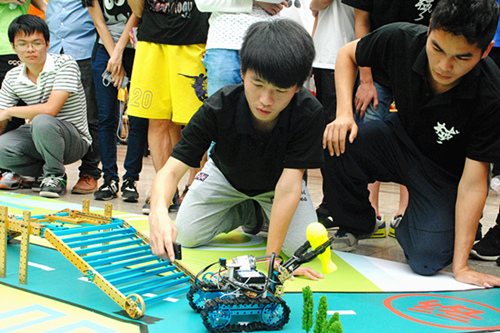 活动现场设立四个区域,竞赛区、校专项机器人团队作品展示区、Makeblock创客工作室作品展示区、游戏互动区,竞赛区供晋级队伍比赛、两个展示区分别邀请了本校专项机器人团队与Makeblock创客工作室的团队参展、游戏互动区则供现场参赛选手和观众互动,并设有奖品。各个展示区都有专业人员为观众解说,让到场的每一个人都了解到机器人的功能。