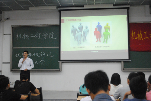 大会伊始,主持人公布各班级初评成绩并介绍评比规则,各班级代表按照预选的顺序开始班级展示。演讲者们通过ppt、视频、舞台表演等方式从制度建设、文化建设、班级活动、班级成就等方面淋漓尽致地向嘉宾评委展现了班级一年以来的成长历程。各班代表幽默风趣、慷概激昂的演讲也赢得同学们的积极回应。参加本次评比的班级各具特色,用饱满的热情带动现场的气氛,如:12机械设计3班,其精心准备的舞蹈得到现场观众的肯定,赢得同学们热烈的欢呼;13工业工程1班凭着理工新闻频道这个创新的开头和“工业工程1班大战英雄联盟”的新颖结尾,获得了全场观众的认可。期间的猜歌游戏环节,同学们也积极的参与其中。现场气氛热情澎湃,掌声、欢呼声接连不断。黄楚刁老师对各个班级的表现满意,并希望同学们能把心中的热情延续下去建筑好伟德国际victor1946这个大家庭。