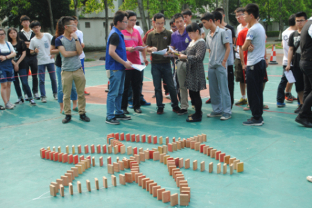 参赛小组分别来自各个不同公司,因相同的兴趣聚到了同一个平台上,展开了友谊的比赛,各小组能力不相上下,创意十足,比赛过程尤是激烈。比赛分为两个回合,第一回合是速度赛,每组参赛选手需以最快速度摆好给定的图形,评委就摆出图形与给定图形的相似度并结合选手们完成图形的速度给分。第二回合是图形创作赛,参赛小组需在18分钟内,用350~400张骨诺牌及相关道具围绕“莞工的美和足迹,我们的爱和创意”这个主题进行创作,摆出自己的作品并顺利推倒。比赛现场,参赛选手充分发挥他们的想象力与创造力,组员们相互配合摆出各种创意图案。