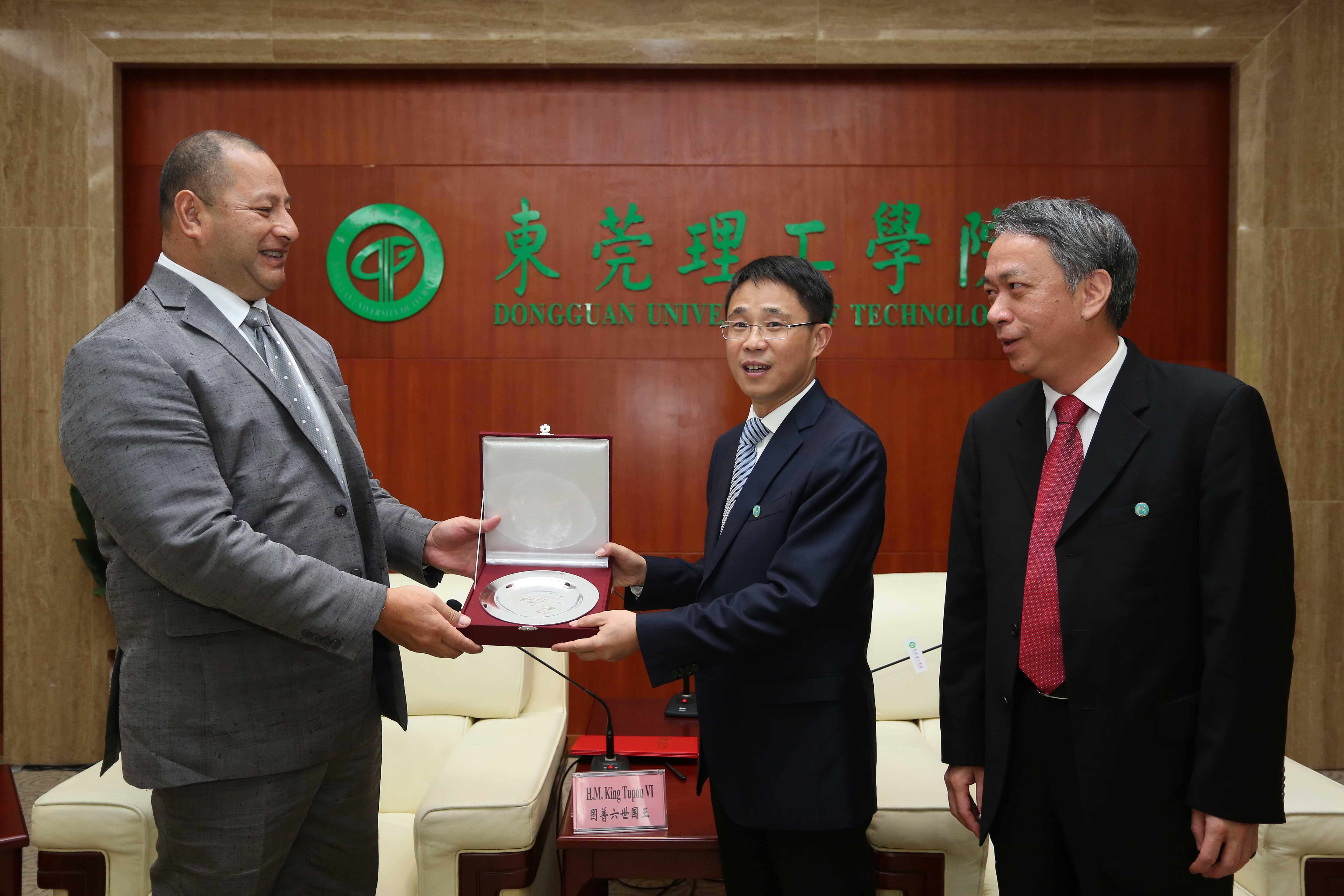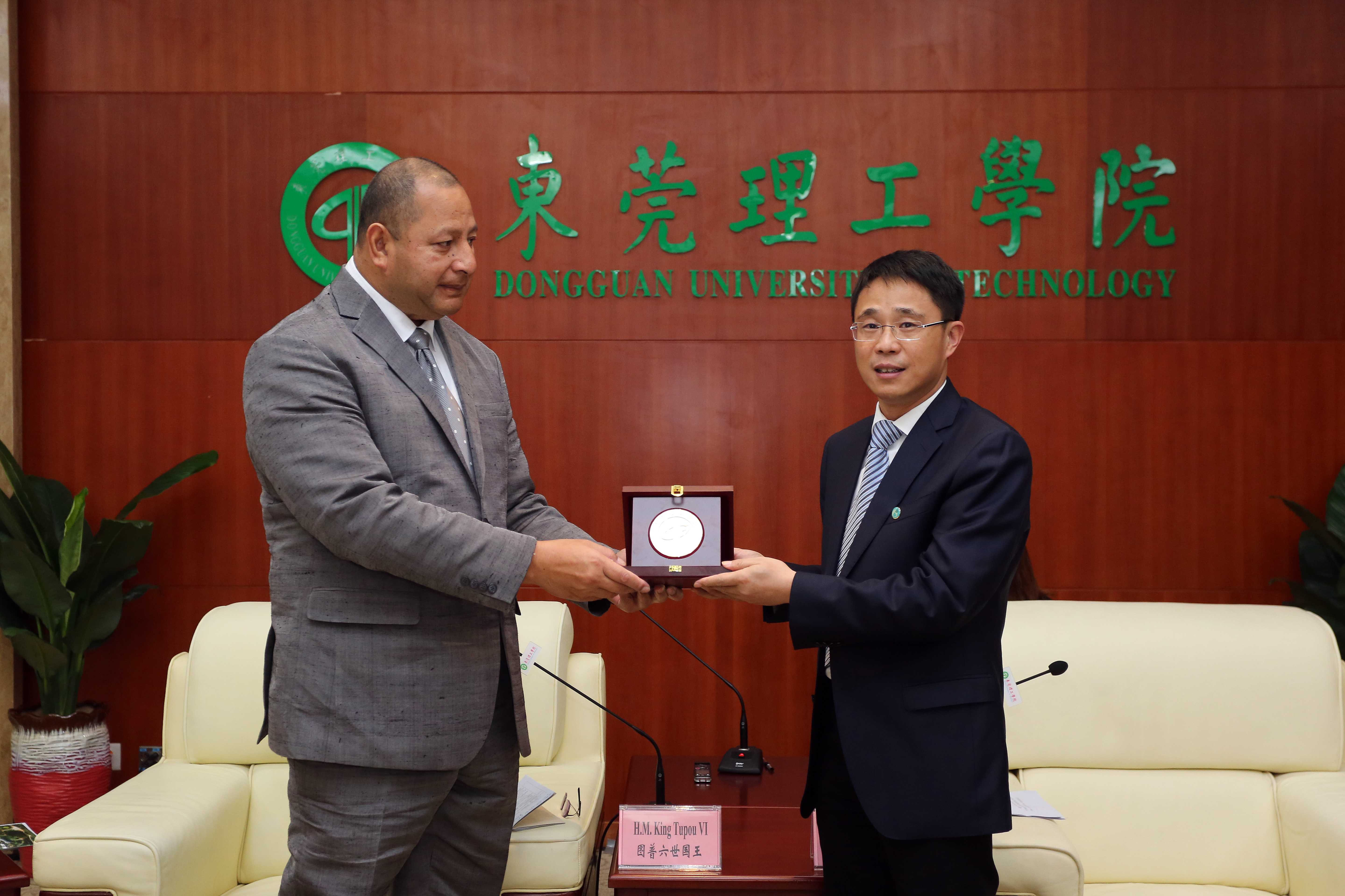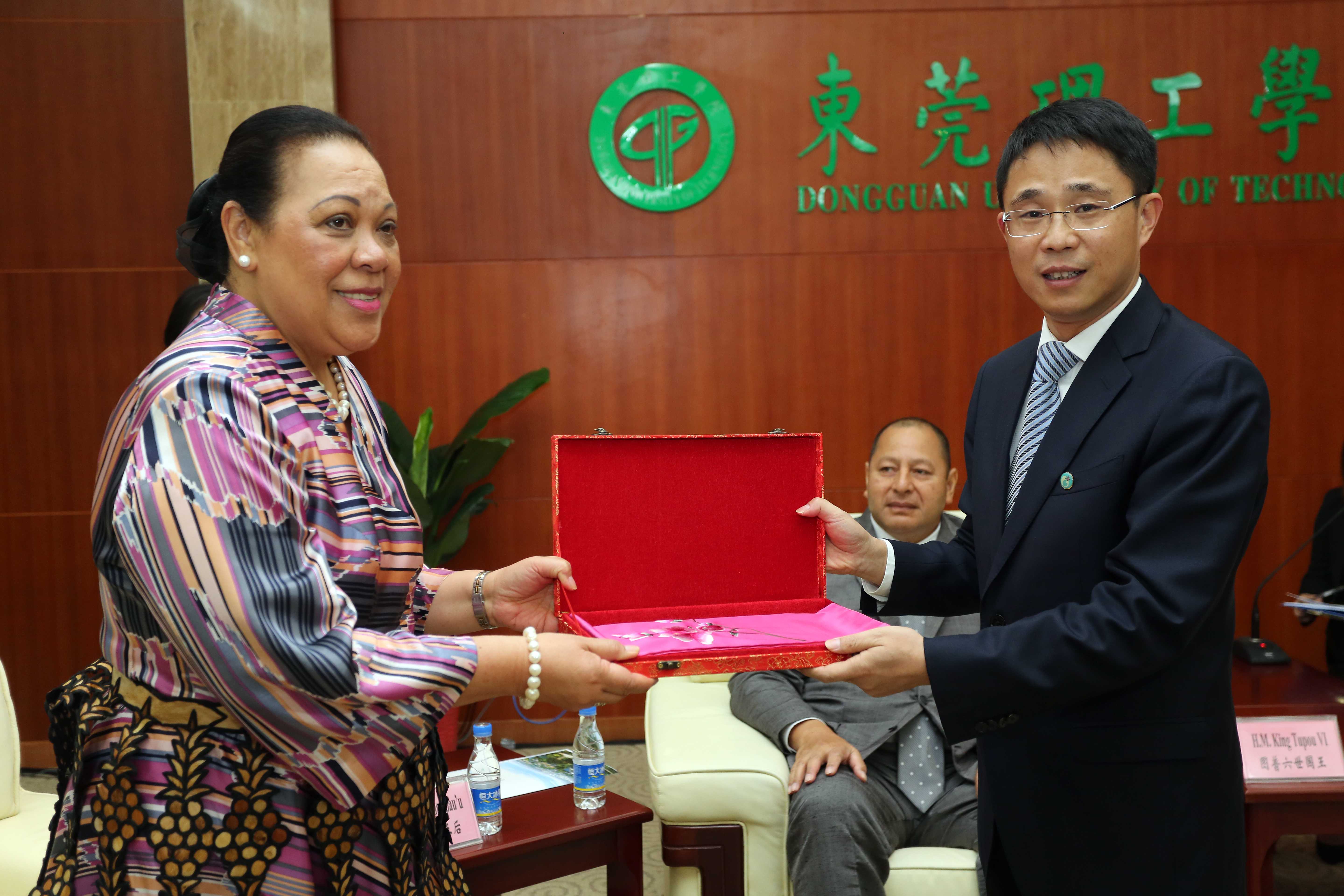 公司党委书记成洪波代表公司师生,对图普六世国王及王后的到访致以热烈的欢迎和衷心的感谢,并向图普六世赠送bv伟德国际1946校徽、向王后赠送粤绣丝巾作为纪念品。