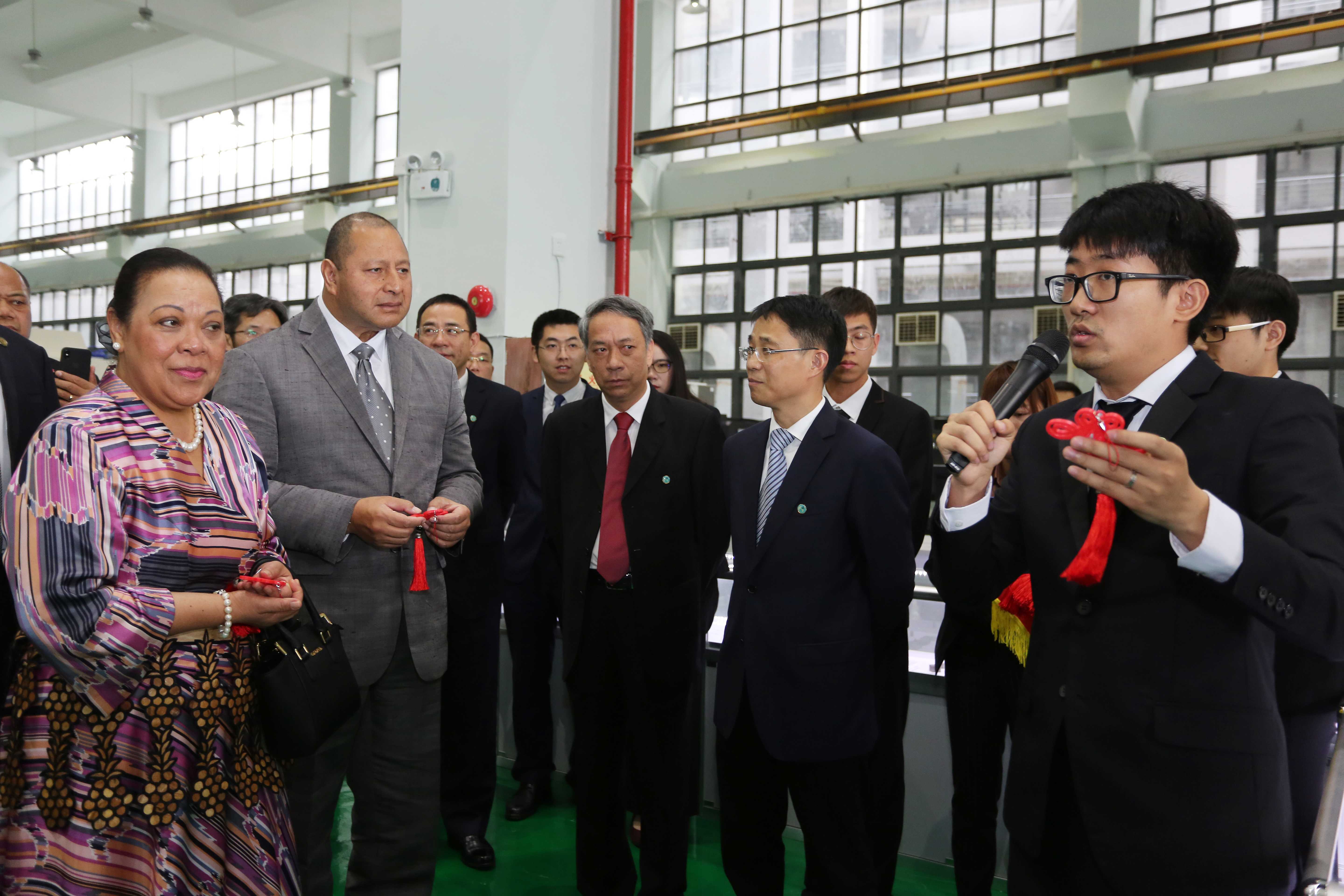 随后,图普六世一行考察了数字装备工程训练中心,实地了解公司师生科技创新成果。现场,公司3D打印项目组的同学向图普六世一行赠送了从自行研制的3D打印机打印出来的中国结,祝福客人们幸福、吉祥。
