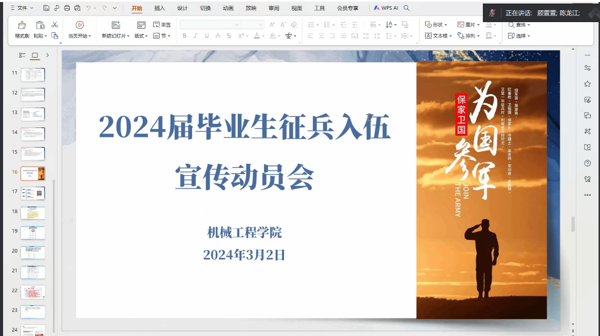 为了扩大征兵宣传影响力和辐射面,激发老员工参军入伍热情深入人心,公司充分利用班级主题班会,统一详细介绍了学费代偿补偿政策的具体内容,让同学们熟悉周知入伍申请条件、申请流程、补偿标准、学业保障和考研、就业相关政策等,鼓励符合条件的员工积极申请。