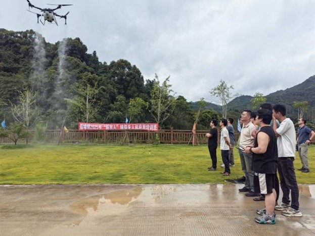 下午的杨家农业发展有限公司田间基地,实操演示环节,两支突击队成员深度参与,他们联合东莞市捷立特智能科技专业飞手团队,围绕“安全规范+实战技能”手把手教学:从高循环锂电池管理、机身结构检查到起飞前环境评估、禁飞区域识别,确保学员掌握“安全第一课”;随后演示的预设航线规划、自动巡航、实时图像回传等技能,模拟当地农田喷药、肥料播撒场景,让技术从理论落地为可操作的实战能力。面对学员提出的“山地作业航线优化”“小地块喷幅控制”等本地化问题,突击队成员与技术团队一同现场答疑演示,让知识真正转化为解决生产难题的工具。