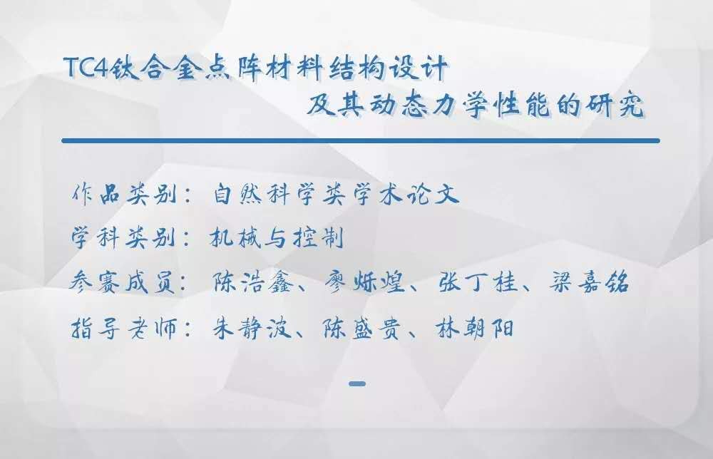 类型三 陈盛贵、林朝阳两位老师协助指导的自然科学类学术论文项目被选入获校级“挑战杯”,题目为《TC4钛合金点阵材料结构设计及其动态力学性能的研究》,参赛员工有陈浩鑫、廖烁煌、张丁桂、梁嘉铭。