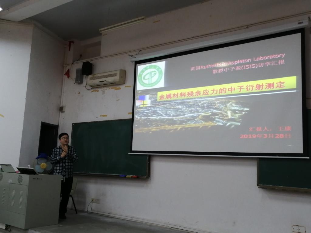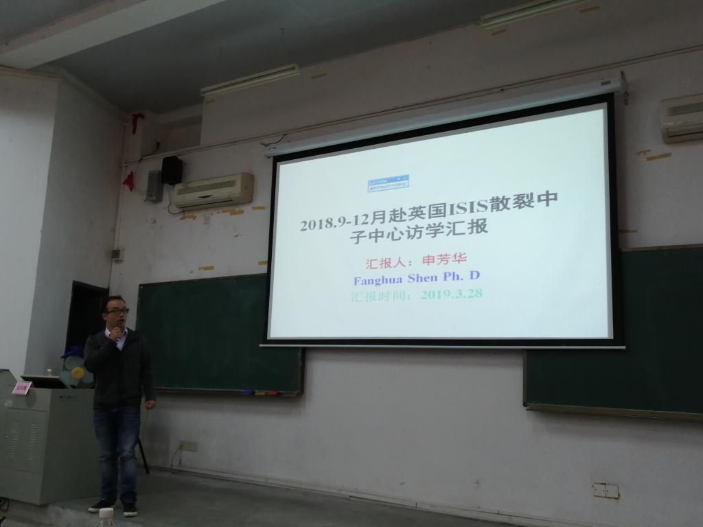 2019年3月28日,伟德国际victor1946首批赴英国散裂中子(ISIS)访学青年老师申芳华、王康、海洋、博士在教学楼6B-102进行了访学成果汇报。院领导孙振忠、钟守炎、黄辉宇、郭建文、陈举铭和公司全体教职工出席报告会。