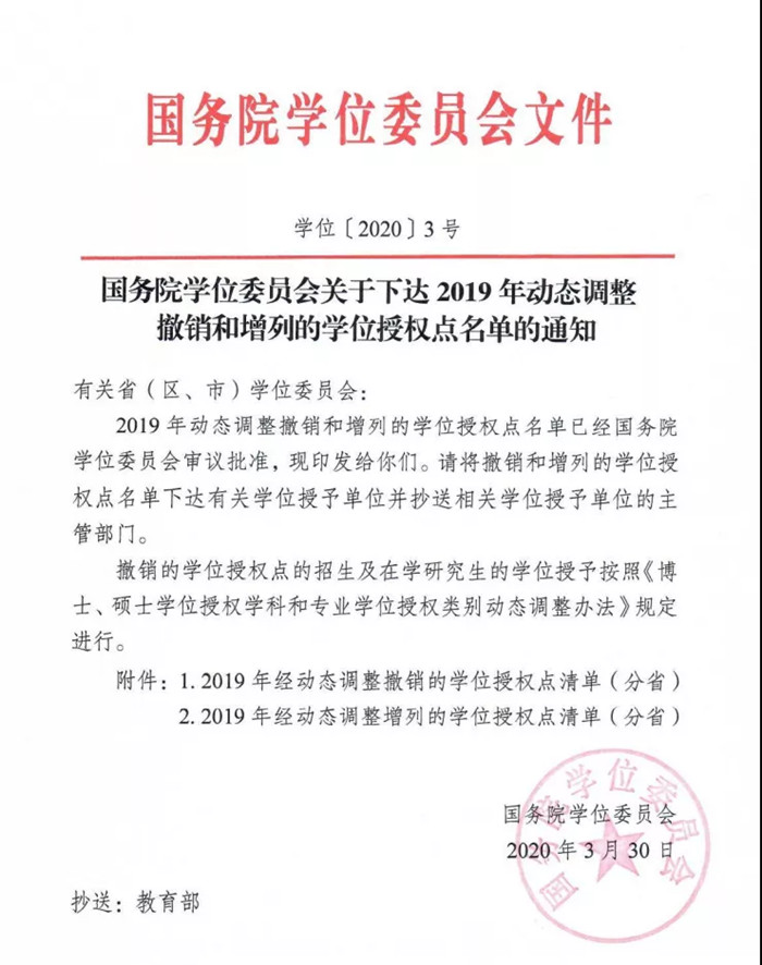 近日,根据《国务院学位委员会关于下达2019年动态调整撤销和增列的学位授权点名单的通知》(学位﹝2020﹞3号),公司机械学位点获增列为硕士专业学位授权点,成为公司继计算机科学与技术、资源与环境后,获批的第三个硕士学位授权点。