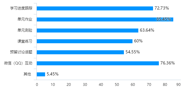 (1)教学准备:公司100%的任课教师在课程开始之前都提前联系了员工,并建立了微信或QQ群,89.09%的教师提前在班群中发布了学习计划、教学进度安排和注意事项、78.18%的教师提前将所需要的课程相关资料上传平台。可见,公司任课教师在课程开课前,都做了充足的教学准备。