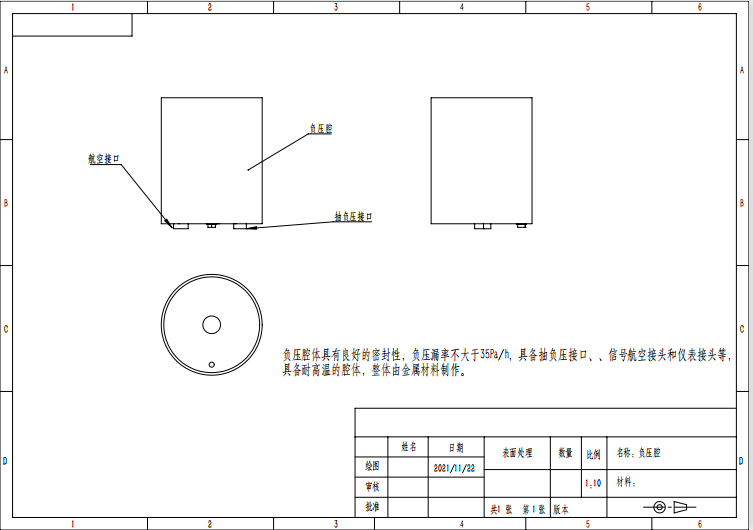 负压腔体具有良好的密封性,负压漏率不大于35Pa/h,具备抽负压接口、强电航空接头、信号航空接头和仪表接头等,具备耐高温的腔体,整体由金属材料制作。 |
