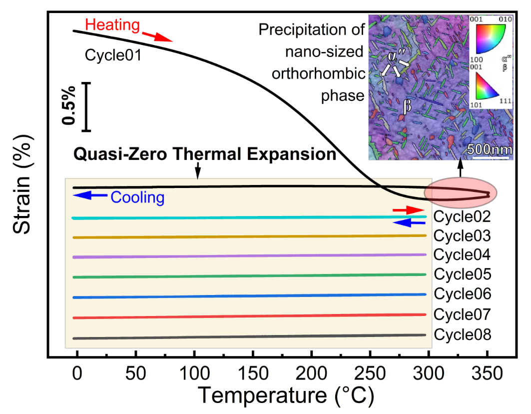 (图1.Ti22Nb合金通过析出纳米尺寸第二相获得的宽温域零膨胀性能)