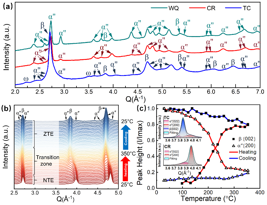 (c)母相及析出相衍射峰强度随温度演化规律)