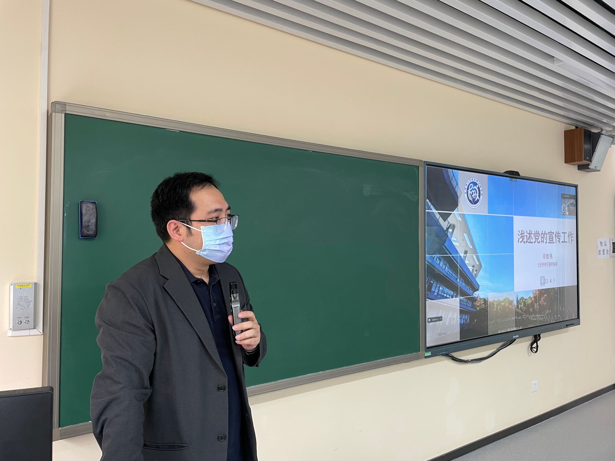 仪式后,邓维伟为全体本科生党员及团支部书记作专题微党课。邓维伟表示,在当前互联网技术大发展的背景下,基层党团组织宣传思想工作需要开放性思维,紧随时代的步伐,高度重视并充分利用信息技术的优势,把握党团工作的新动态,坚定马克思主义的指导地位,更好的统一思想、统一意志、统一行动,实现宣传思想工作与信息技术的深度结合,更好地承担起举旗帜聚民心育新人兴文化展形象的使命任务。